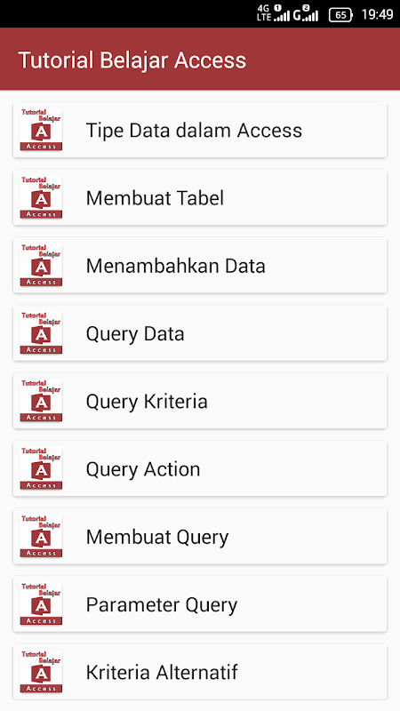 Apabila Anda mencari tutorial untuk belajar basis data Access dengan Bahasa Indonesia, maka Anda perlu segera mendownload dan menginstal Aplikasi Tutorial Belajar Access ini di perangkat mobile Anda.