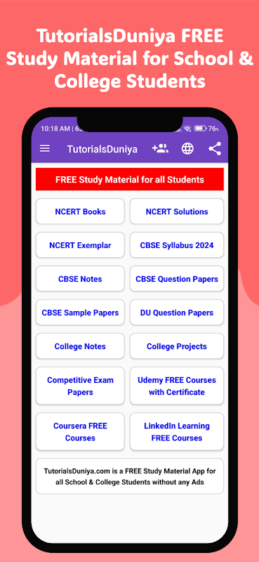 我創建了這個TutorialsDuniya 應用程序,透過免費提供所有學習材料來解決每個學校和大學生的學習材料問題。