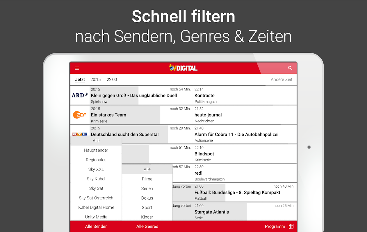 有了這個程序,你得到的各種TVDIGITAL印刷的電視節目表的所有站廣播組,如天空衛星,天空電纜,娛樂,有線數字家庭,T-家庭,Unity媒體和Sky衛星奧地利。也就是說,免費電視廣播機構,如ARD,ZDF,RTL,SAT1,Pro7上,RTL II,VOX和Kabel 1和付費電視頻道,如天空足球甲級聯賽和天空體育。有每個人的東西在那裡!
