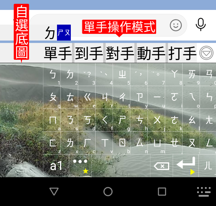 ★ 41鍵可無聲調注音用上或下滑可取代注音。例如「牌照稅」「ㄆㄓㄕ」不小心輸成「ㄊㄓㄕ」,點編輯區的ㄊ移游標,上滑ㄆ按鍵,就會ㄆ取代ㄊ,點ㄕ到結尾就可以選「牌照稅」。