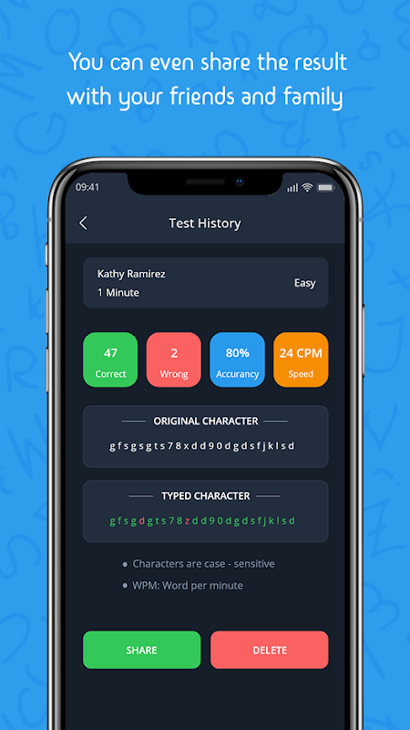 📈打字大師速度測試應用程式顯示您的結果或統計數據如下,