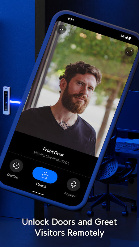 點擊應用程式中的「門」圖示、搖晃行動裝置或將裝置靠近門上的讀卡器,即可解鎖已連接的門禁。指定的門衛還可以透過 UA Pro 讀卡機與訪客互動,並遠端授予存取權限。