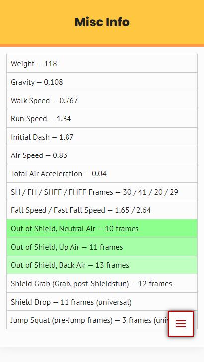 啟動、活動、盾牌優勢/劣勢、盾牌外選項等等!現在包括碰撞箱影像!造訪 https://ultimateframedata.com 以取得網頁版(IOS 使用者可以加入主畫面)。
