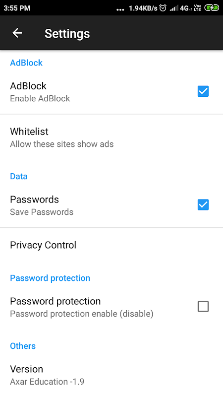 Unblock Site Browser is Use to Setting In to Password Protect Enable and Enter Password and again ReEnter Password or ok press then restart again your app at a time Security is Best Work and enter your password is right then open Unblock site Browser and Password is Wrong at a time Close this app.