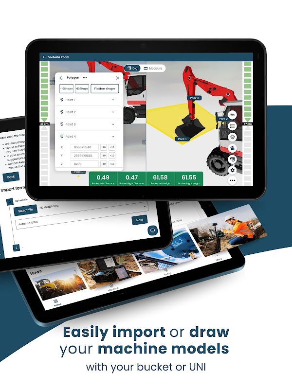 該系統基於 marXact 的高端 RTK GNSS 技術和 Nijhuis Engineering 強大的機器感測器構建,可確保挖掘機鏟鬥可靠且精確的定位。它的設計易於使用,使所有技能水平的操作員都能提高其性能並完全按計劃工作。 UNI-Machine 可在 Android 和 iOS 裝置上運行,並可透過藍牙與外部 GNSS 接收器整合。