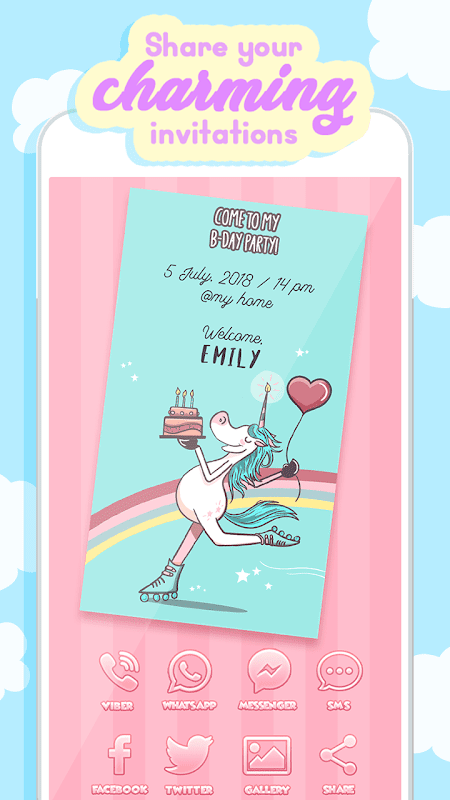 通過發送迷人的🦄”獨角獸 生日請柬”🍧給您的朋友投擲最好的“kawaii 黨”!安裝“e卡”製作應用程序,並免費選擇您最喜愛的邀請模板!在最新的邀請卡創作者免費發現可愛的“卡哇伊的邀請”!獨角獸主題邀請卡設計會讓你喘不過氣來!免費探索“生日快樂”邀請卡創作者!使用派對邀請應用程序製作您自己的電子賀卡!看看充滿閃光獨角獸邀請的賀卡畫廊!使用kawaii創作者修改免費卡片,直到您滿意為止!用這些可愛的“生日賀卡”驚喜你的客人!在神奇的“聚會邀請”卡創作者的幫助下美化你的生日派對!不要在貴重的定制卡上浪費你的時間和金錢。獲得獨特的彩虹邀請現代設計和柔和的色彩完全免費!神奇的kawaii生日邀請在卡片編輯器中等待著你!