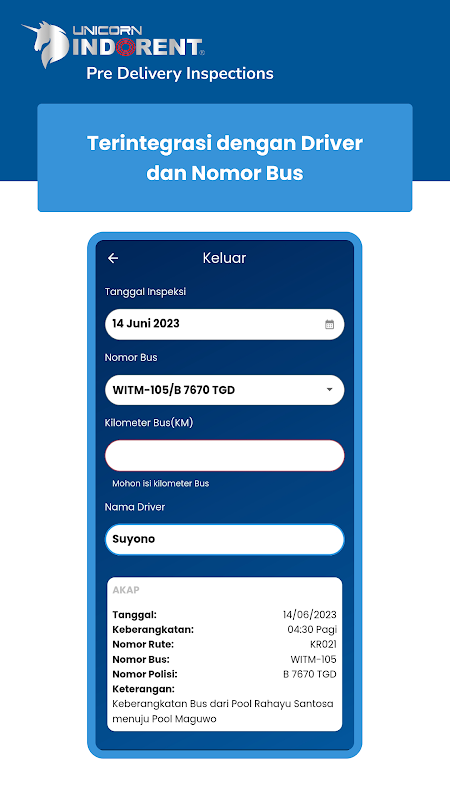 Unicorn PDI 旨在讓機械師更輕鬆地維護 Unicorn Indorent Buses。有一個功能,機械師可以檢查和記錄 Unicorn Bus 的狀況和狀況,從而在運營中最大限度地提高公交車的質量和維護。