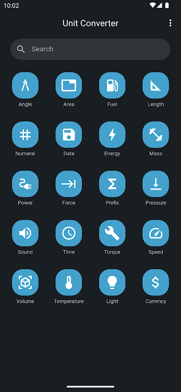 - 綜合類別:轉換 20 多個類別的測量值,包括長度、質量、速度、體積、溫度、能量、功率、力、數據和貨幣。