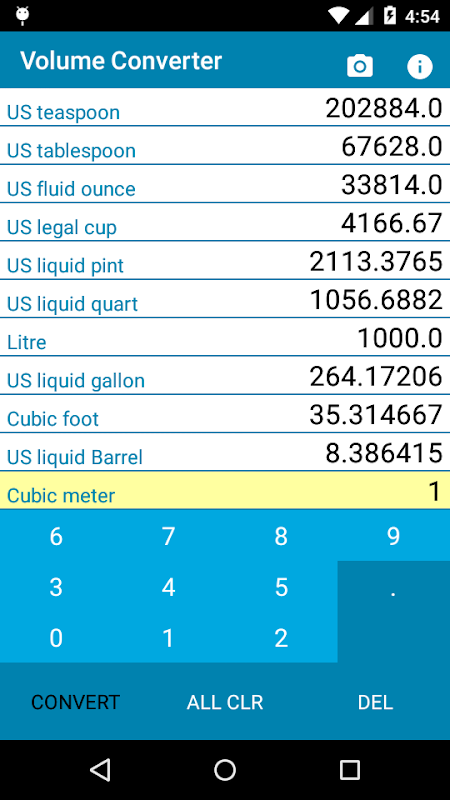 This app converts and shows volume in 11 different units like US teaspoon, US tablespoon, US fluid ounce, US legal cup, US liquid pint, US liquid quart, Liter, US liquid gallon, Cubic foot, US liquid barrel and Cubic meter. All the values can be read at a time as they are displayed on single screen.