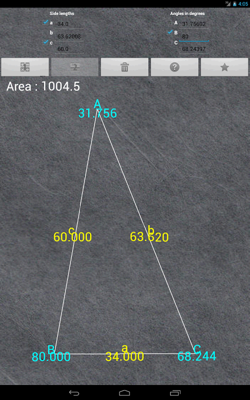 這個應用程序是一個三角形的通用計算器。當你給三個參數(邊或角),該工具計算剩餘的參數和三角形的面積。