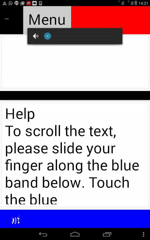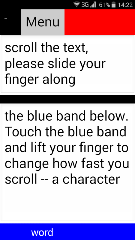 To scroll the text, please slide your finger along the blue band below. Touch the blue band and lift your finger to change how fast you scroll -- a character or word at a time, or to the next punctuation mark. To quickly reach different parts of the text, simply touch the black band in the middle, and lift your finger. The closer you touch to the left of the screen, the earlier the portion of text that is displayed to you.