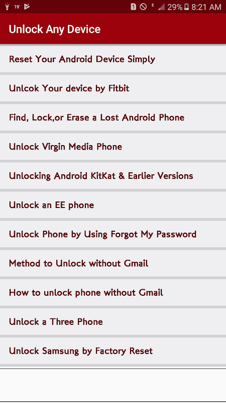 Unlock any device guide free to protect and secure data. Everyone needs to secure data or preventing unauthorized use of his data in this modern era. One method to protect your phone data is to lock your phone screen by pattern, pin or in other way like face recognition. This app provide guide to solution of problems of device locking or unlocking. Easy Unlocking Guides Process Explained.