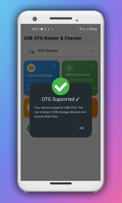 USB OTG 讀取器和偵測器可快速偵測裝置對 USB OTG 的支援和相容性,並允許您使用手機連接、瀏覽和管理 USB 上的檔案。
