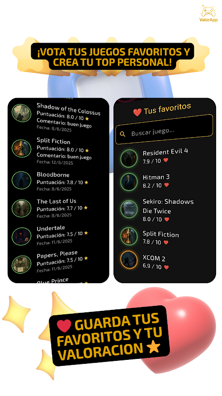 ValorApp 擁有現代化、快速的介面,並且完全支援西班牙語,幫助您探索新遊戲、留下評分和評論、賺取金幣、解鎖獎勵,並躋身最活躍玩家排行榜。所有功能均可透過現代化、快速的介面完成,並且全部支援西班牙語!