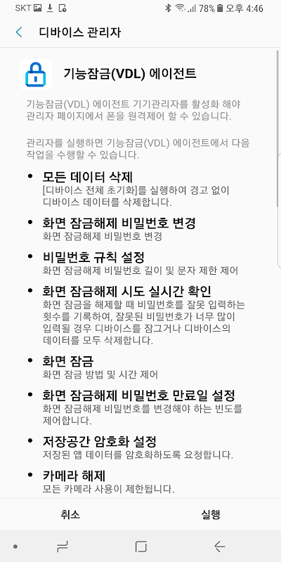 이 앱에서는 기기 관리자 권한이 사용됩니다. 이 앱은 절대 단독으로 실행되어 동작할 수 없으며 반드시 회사의 보안앱과 연동되어 사용됩니다. 또한 그 외의 목적으로는 사용되지 않으며 회사의 보안 방침에 따라 다음과 같은 기능이 사용될 수 있습니다. 회사의 보안방침은 회사의 보안앱에서 확인할 수 있습니다.