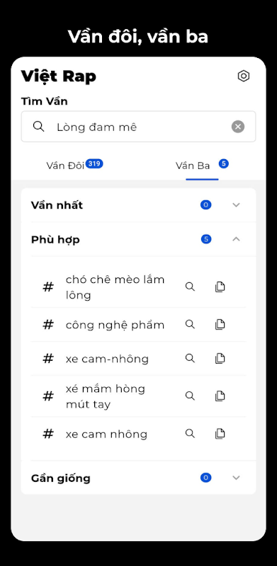 該應用程式整合了豐富的越南語詞彙資料庫,包括說唱和詩歌中的常用詞和專業詞。