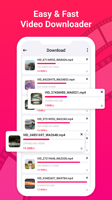 視頻下載器應用程序自動檢測視頻,您只需單擊傳輸按鈕即可。根據需要暫停、恢復或排除下載。它一起支持多個下載和後台下載。