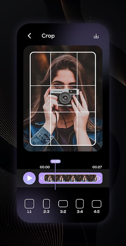 從手機圖庫中選擇您喜歡的視頻進行編輯。長按可在視頻的所需部分添加效果。選擇視頻的濾鏡、視頻比例和貼紙。使用驚人的字體樣式和吸引人的顏色在視頻上添加貼紙。將喜愛的音頻添加到您的視頻、設置音量並可以對其進行剪輯。保存所有更改。
