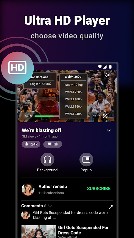 Viva Tube Vanced support background play and floating pop up mode, when you are working or sleeping, you are still able to enjoy tube videos and music, no ads will interrupt playback.