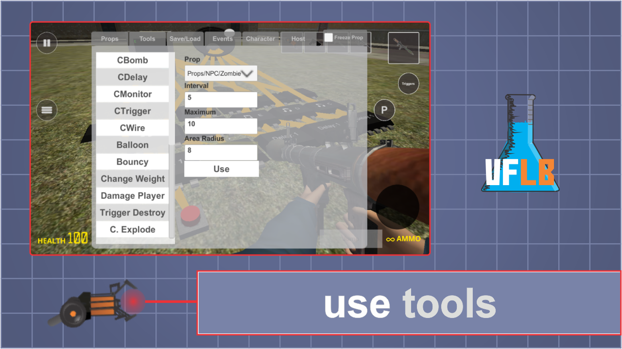 - Use tools: Weld, Thrusters, Spawner and more..