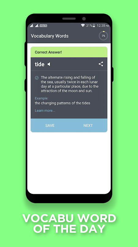 Vocabulary Builder app's WORD OF THE DAY feature provides you with an English Word every day so you learn a new English word every single day. You are reminded to learn new Vocabulary words by playing this Vocabulary Builder app every day with motivational quotes, so you don't lag behind.