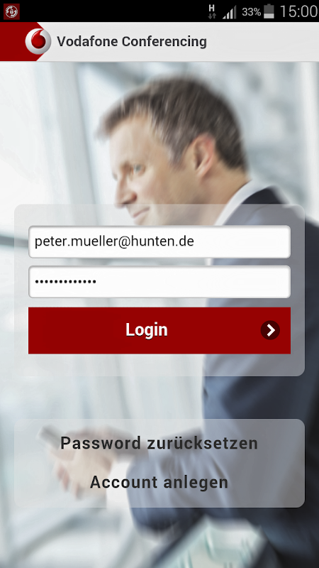 要在智能手機上使用這個應用程序與沃達丰會議,請註冊免費的應用程序,或者以前在http://conferencing.vodafone.de。如果你已經有一個公司帳戶,請使用此登錄數據。