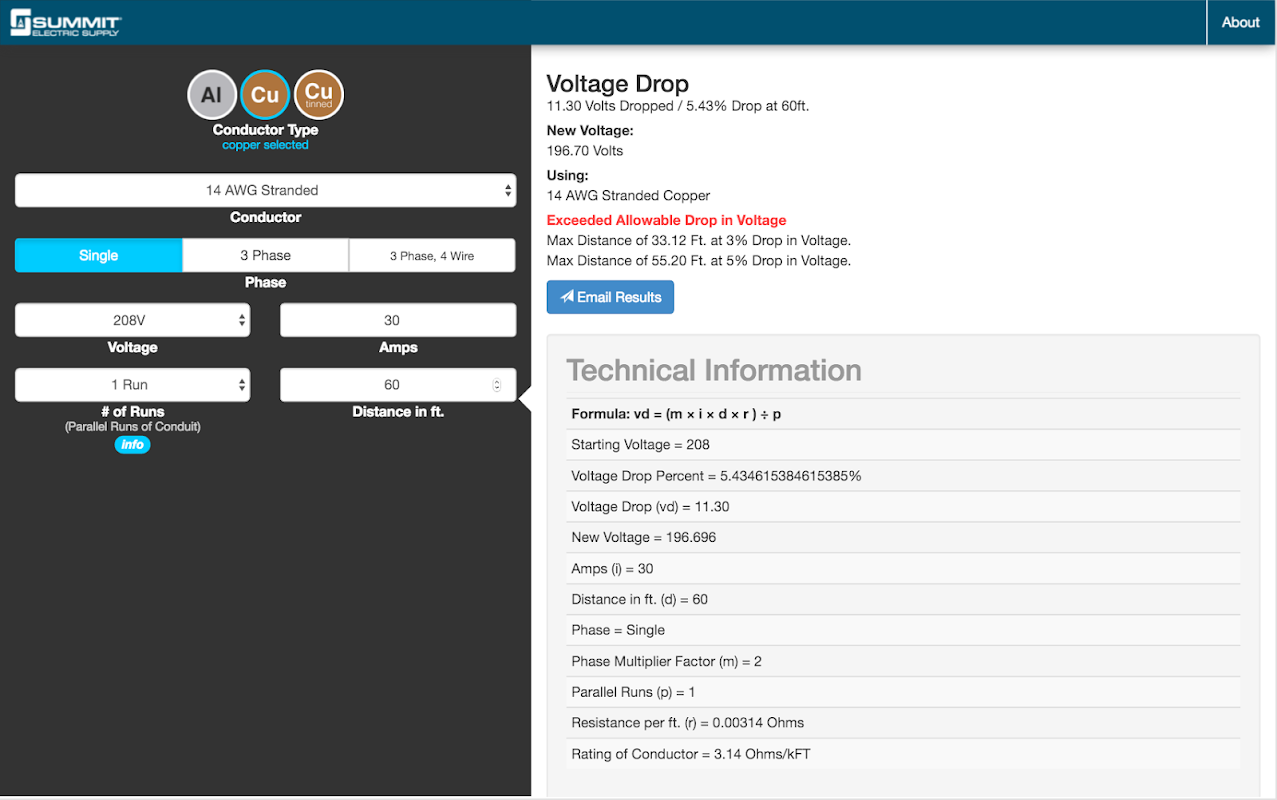 峰會的電壓降計算器可以讓你快速計算和基於2014年NEC選擇的導體尺寸和類型的份額的電壓降。這種簡單和易於使用的計算器能夠為任何規模大小作業或項目的專業效果。只需選擇你的指揮,然後輸入你的電壓,電流,相位,距離和運行次數,以確定新的電壓和百分比下降。你會得到包括使用的公式以及詳細的技術信息,每次計算立竿見影的效果。