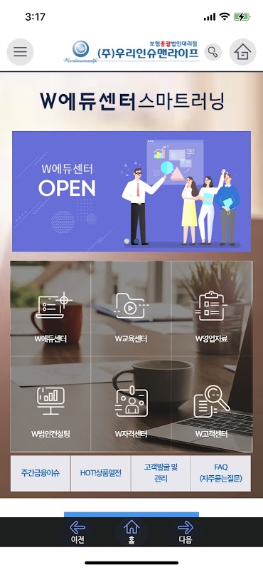 우리인슈맨라이프임직원 및 설계사를 대상으로 외부 및 내부 콘텐츠를 웹과 모바일앱을 통해 제공하고 있으며, 보험상품, 영업교육, 자격교육 등 동영상강의와 더불어 문서 또는 이미지 파일을 통해 서비스하고 있습니다. 모든 콘텐츠의 경우 카카오톡 공유를 통해 타인에게 전달이 가능하며, 오픈이 되어 있는 콘텐츠는 무료로 열람이 가능합니다.