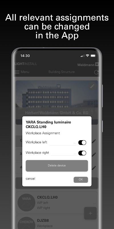 Waldmann LIGHT INSTALL 應用程序可以安裝和調試 Waldmann 燈和傳感器。在應用程序中創建一個建築結構,類似於安裝設備的現有結構。