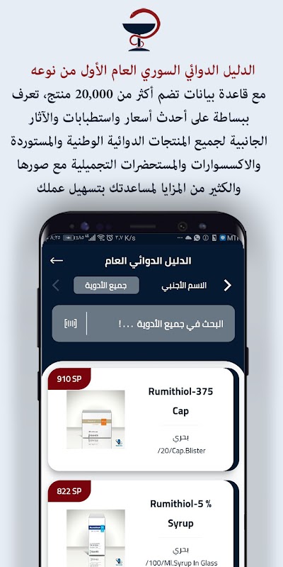 كما يحوي خدمة الدليل الدوائي السوري الأول من نوعه بقاعدة بيانات لأكثر من 20,000 منتج دوائي وطبي واكسسوارات ومستحضرات تجميلية، ومتوفرة معظمها مع صورها وأسعار المبيع للصيادلة والعموم وبآخر تحديث للأسعار، بالإضافة إلى التركيب الكيميائي لكل دواء والعيار الطبي له والزمرة الدوائية واستطبابته وآثاره الجانبية، وتتوفر إمكانية البحث عن أي منتج عبر الباركود (عبر كاميرا الهاتف) أو عبر الاسم العربي أو الانكليزي أو التركيب الكيميائي أو البحث عبر الاستطبابات لإيجاد الدواء المناسب.