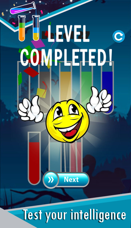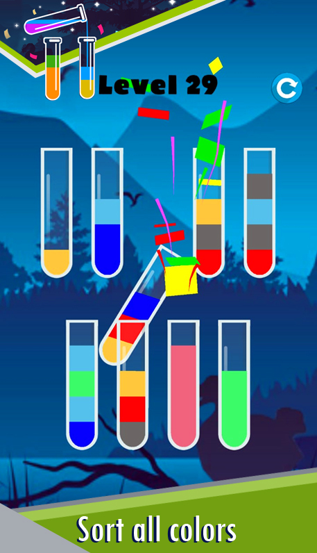 Use your brain and correctly sort the colors in each tube. There are tubes filled with different colors. Quickly sort the colored water in the tubes until all the same colors are gathered in each tube and become a leader of this "Water sort puzzle - color sorting". You can only pour water of the same color at the top, and the tube you pour has enough space. So be careful when filling the tube. You can restart your level at any time during your puzzle game.