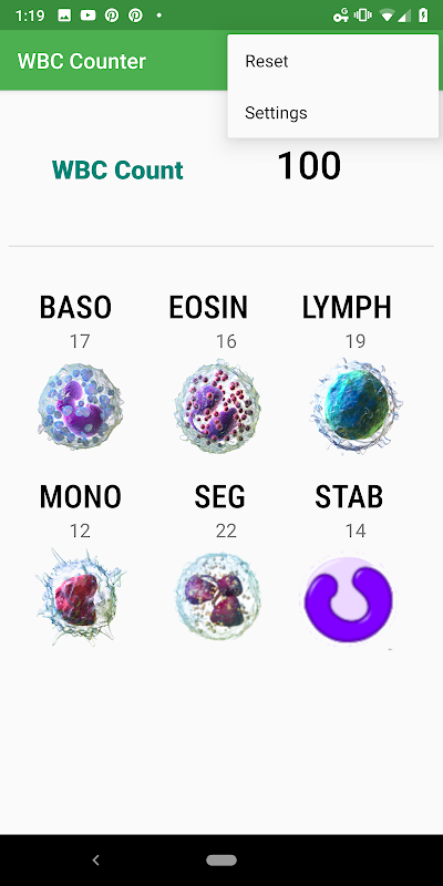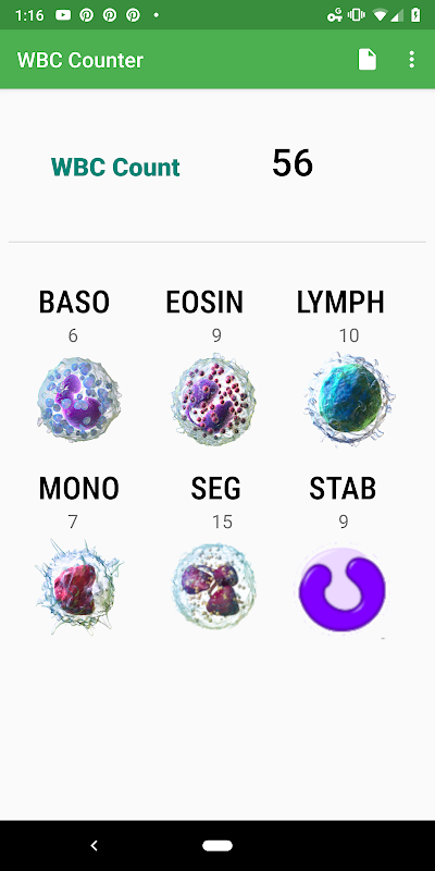 這個應用程序支持中性粒細胞,分段,帶,嗜酸性粒細胞,嗜鹼性粒細胞,淋巴細胞,單核細胞計數。