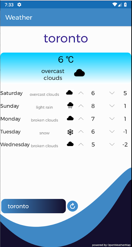 該應用程序的構建考慮了簡單性,可按城市提供當前天氣和大氣狀況。還有一個刷新按鈕可以更新天氣。