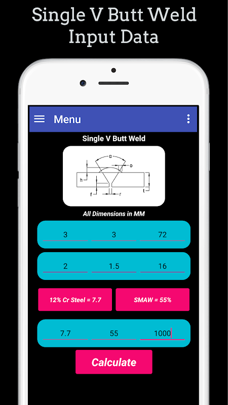 該應用程序可用於計算各種類型的對接焊和角焊縫(例如方形對接焊,單斜角對焊,雙斜角對焊,雙斜角)的焊接金屬重量,焊接金屬成本,焊接電極要求,焊接填充金屬要求可變角度對接焊,單V對接焊,雙V對接焊,雙V可變角度對接焊和角焊等。在執行焊接工作或使用焊接方法的所有行業中都非常有用。