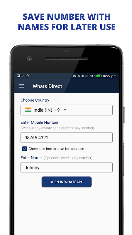 Whatsdirect helps you to open a chat with any number without even saving it in your contact list. This app helps you in situation where you have to message some unknown person without saving their contact. This app is build with features with helps you to save the number with name(optional). These contacts will be saved locally in the app so that you don't need to worry about having these names and numbers in your actual contact list.
