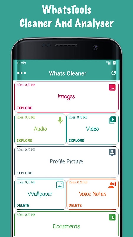 - Cleaner enables you to find and delete files sent and received via whatsap in order to save space on your device.