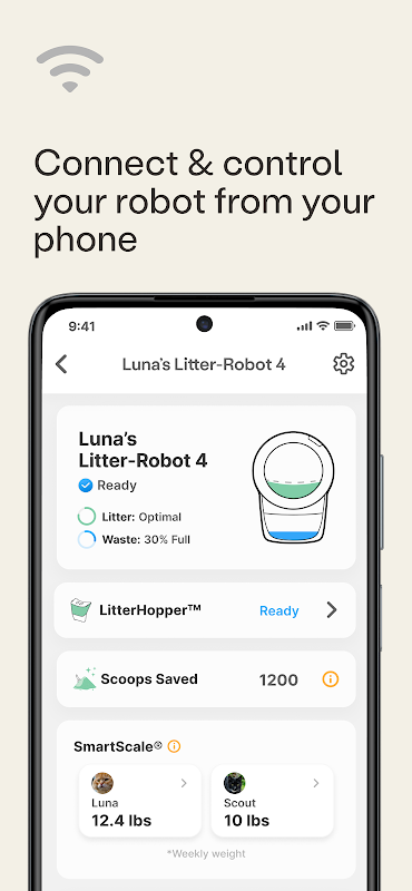 隨時隨地使用 Whisker 應用程式監控、控制您的 Whisker 設備(包括 Litter-Robot 和 Feeder-Robot),並取得相關資料。