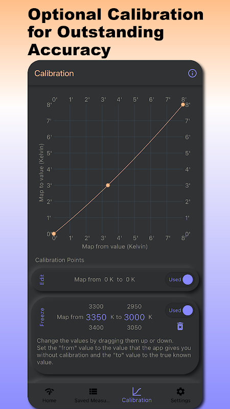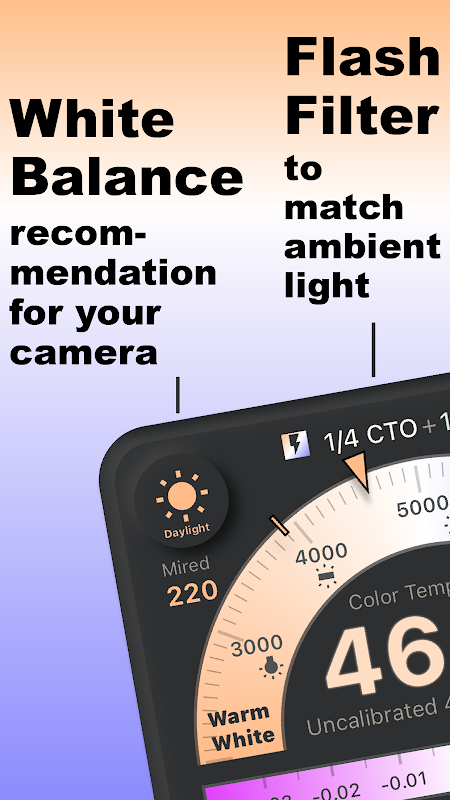 為了確保盡可能高的準確度,本應用程式使用普通白紙或灰卡來測量色溫(CT,相關色溫,CCT)。只需確保紙張被您正在測量的光源照亮並避免任何色偏。雖然通常沒有必要,但校準可以進一步提高準確性。