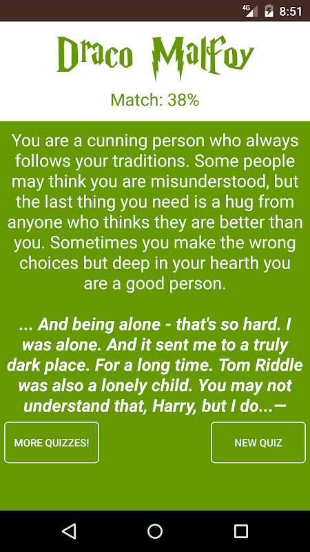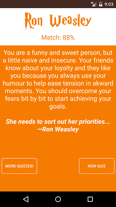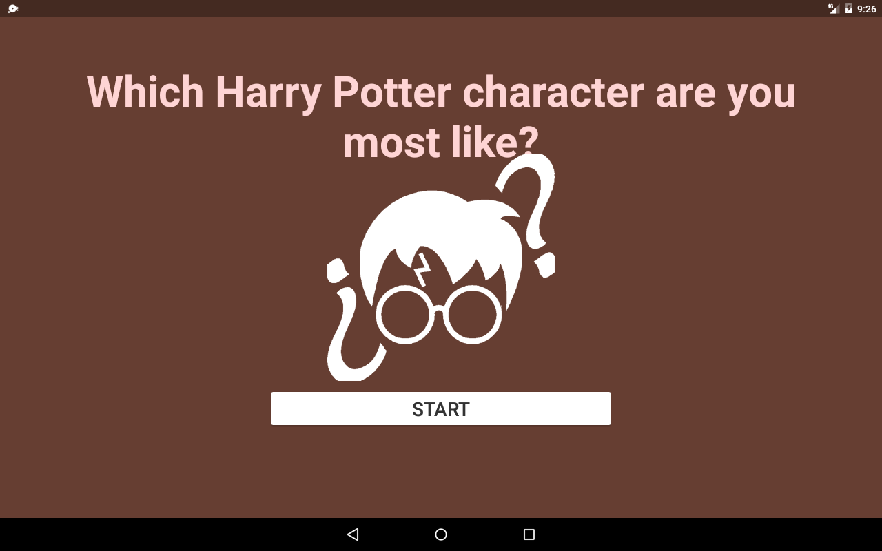 This is an unofficial quiz app which try to find which Harry Potter character are you most like. Through a random set of questions, this quiz will analyse your personality to find out the Harry Potter character that best matches your traits and then will tell you what you both have in common.