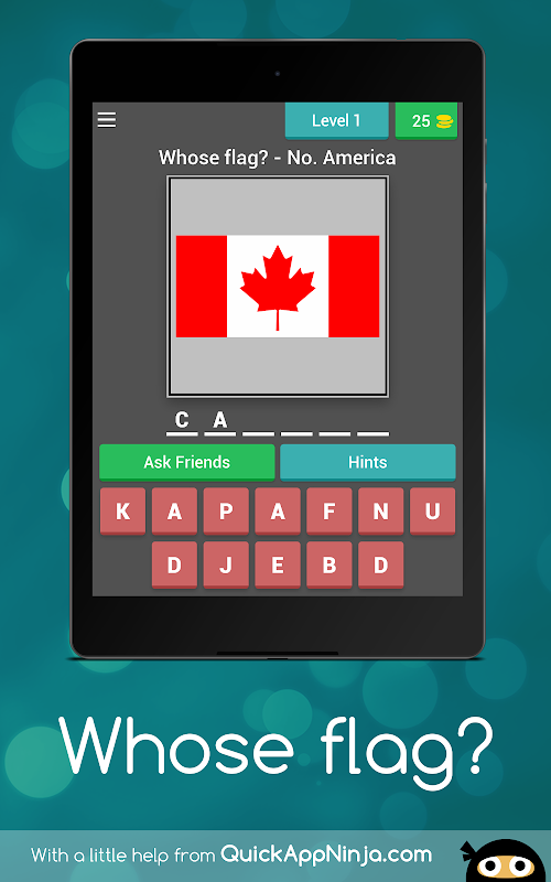 Use the letters (but usually not all of them) to spell out the name of the country whose flag is shown. Hints are available.