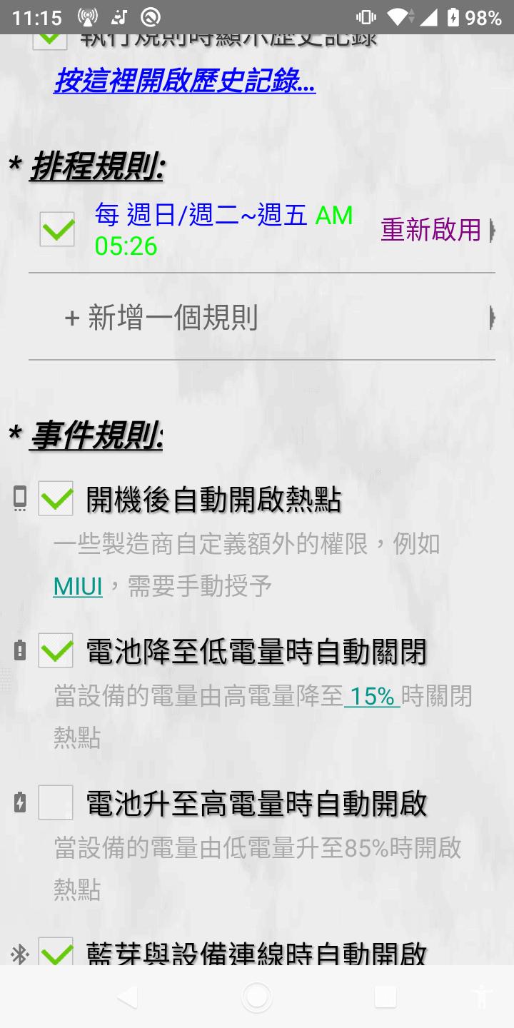 3.多種觸發熱點的事件:手機開機時啟用熱點, 藍牙設備連接時啟用熱點, 電池電量低時停用熱點, 電量高時啟用熱點, 倒數計時關閉熱點,還有更多...