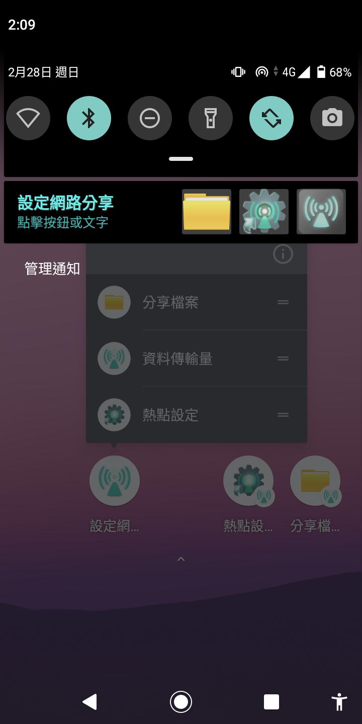 6.各式捷徑:桌面,應用程序圖標和通知欄捷徑可進入相關設置,切換熱點,調用QR二維碼以提供掃描綁定或共享文件!