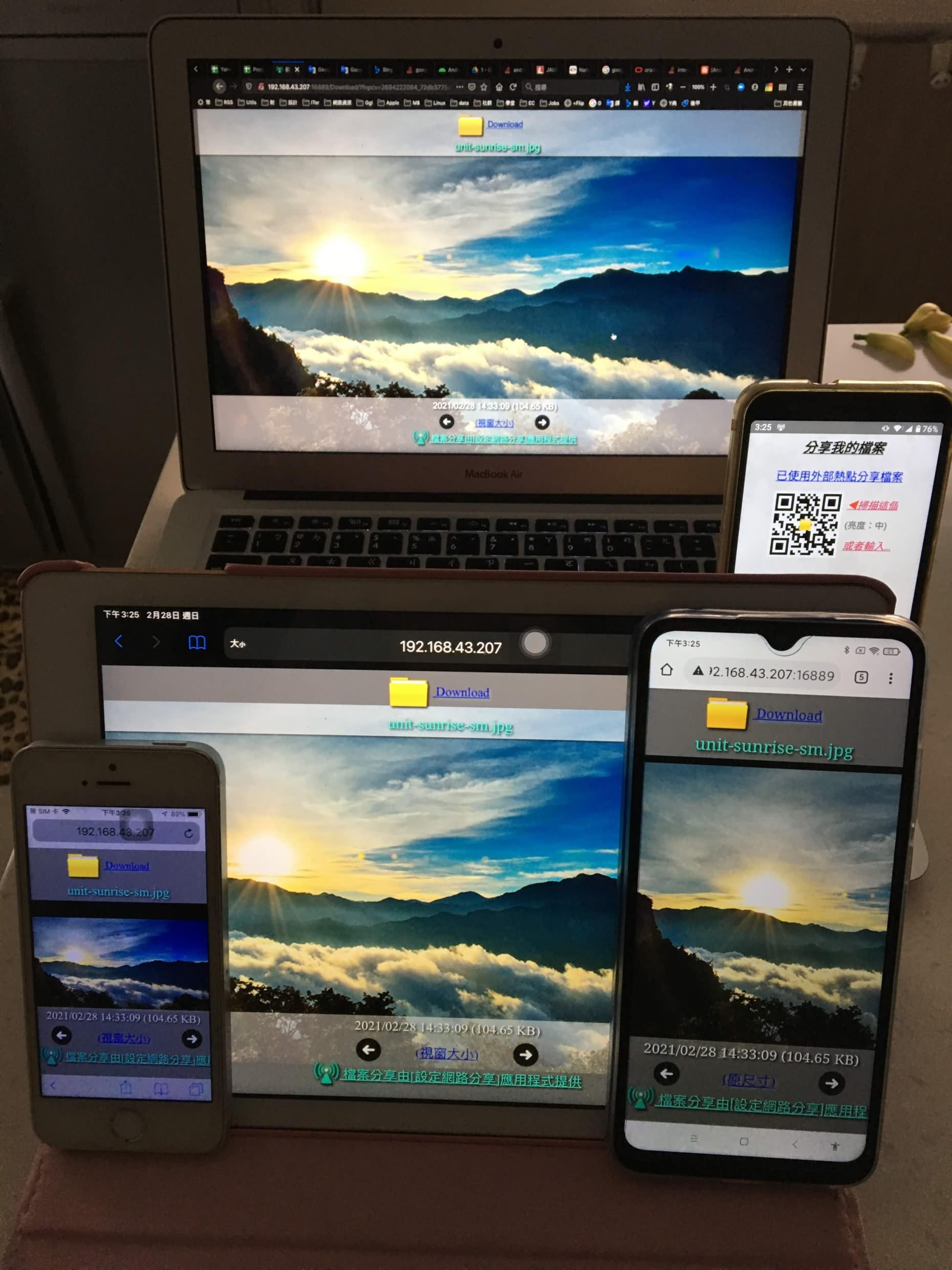 5.通過熱點或Wi-Fi共享文件:配置共享文件夾,生成QR二維碼供其他設備直接掃描和訪問。內建客戶端圖片查看器可以快速導航,無需安裝額外的軟體。即使沒有internet,也可以通過Wi-Fi將文件快速傳輸到任何移動設備和PC。