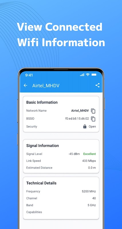 • 查看網路詳細信息,例如 SSID、IP 位址、連結速度、頻道、頻段、頻率等