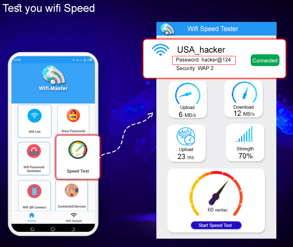 概述: Wi-Fi 密碼顯示是一個應用程序,可顯示連接到您的 android 設備的所有 wifi 密碼。 Show wifi password 是一款無需路由設備即可查看連接的 Wi-Fi 密碼的應用程序。現在每天大家都在關心如何找到已連接網絡的WiFi密碼?這個 Wi-Fi 密碼閱讀器和 WiFi 速度測試器是最適合那些人的應用程序。您可以生成 wifi 密碼來連接不同的網絡,還可以使用我們的 wifi 密碼顯示應用程序測試您的 wifi 速度和打開 Wi-Fi 列表。它是一個完整的wifi 工具通過您的 android 設備上的 Wi-Fi 使用互聯網。我們還可以使用此應用程序的 wifi 二維碼生成器和 Wi-Fi 熱點功能將我們的 WiFi 網絡連接到其他設備。這個應用程序的另一個主要特點是 wifi 地圖顯示,您可以在地圖上找到連接的 wifi 網絡的位置。 wifi 密碼應用程序將為您提供一些額外功能,例如您的移動信息、連接的 Wi-Fi 速度和 wifi 下載以及您設備上的 Wi-Fi 上傳速度。Wi-Fi 自動或 wifi 計時器是此 wifi 密碼生成器應用程序的另一個最佳功能您可以為您的 wifi 網絡設置計時器。您可以設置 wifi 自動關閉和打開的時間。