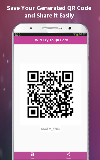 From here, tap the floppy disk icon to save your QR code as image file in your photo gallery and start to share the WIFI password QR code with your friends.
