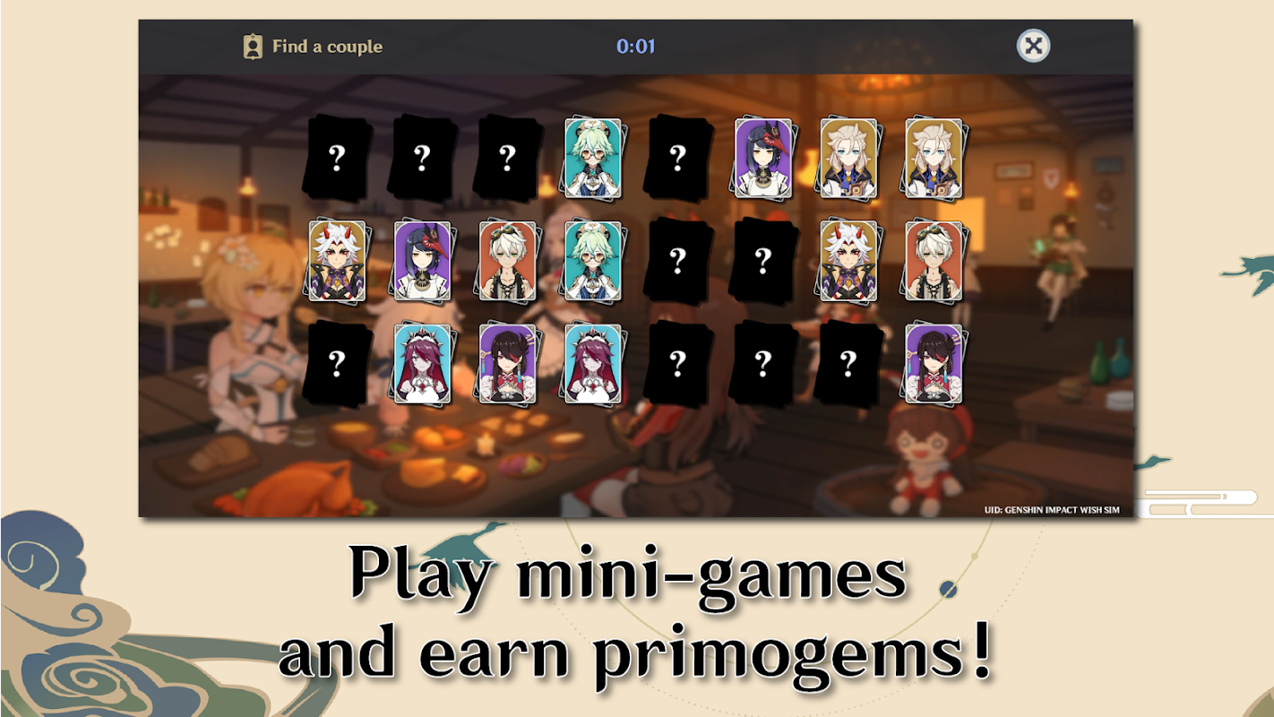 In this Genshin Impact Wish Sim you can get all the coveted characters from Genshin Impact, the chances are realistic and everything is just like in Genshin Impact! You can also browse and build your collection of characters, and enjoy your collection, as the game has a Character Gallery and a Weapon Gallery! Try this Genshin Wish!