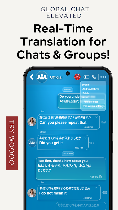 我們在您的會議中引入實時翻譯,當您與使用不同語言的人進行實時會議時,WOOOO A.I 可以有效地工作。實時翻譯可在聊天和實時通話中使用。
