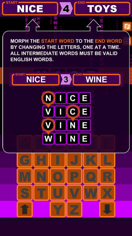 In Word Edge, your goal is to smartly morph a start word to an end word by changing the word one letter at a time. All the intermediate words have to be legitimate English words. Do it in equal or fewer steps than required to score golden trophies.