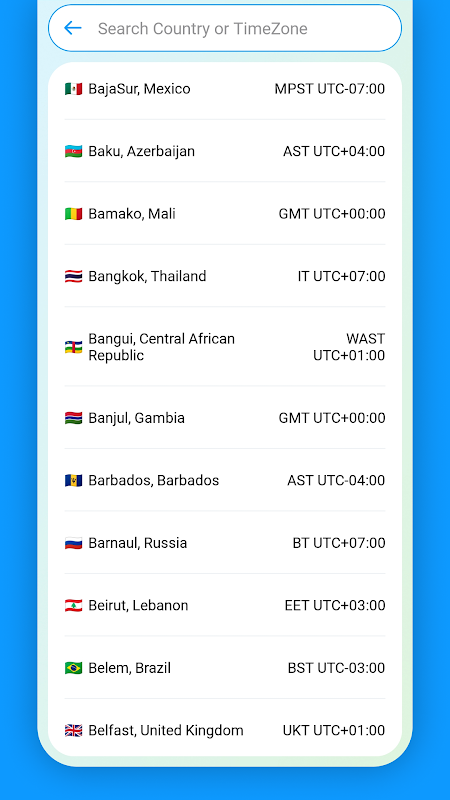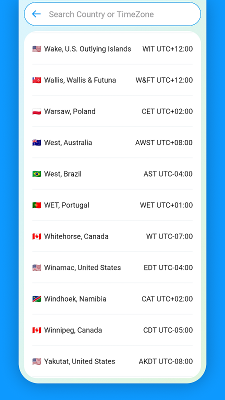 Easily explore world time zones, quick search city or country.
